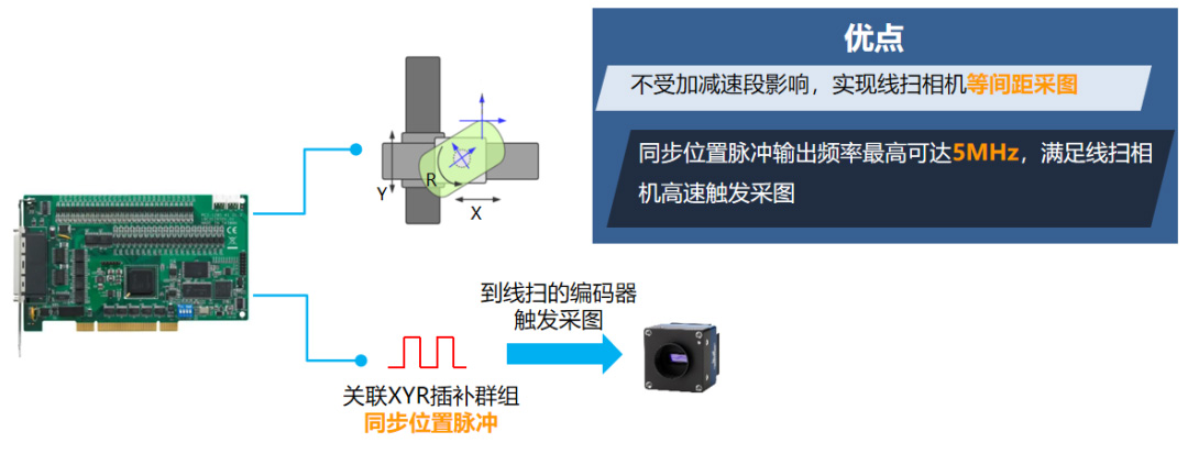 研華針對這一應用難題,提供了專用于該場景的運動控制卡PCI-1285T,運用多軸旋轉刀尖跟隨算法,高速連續(xù)的將外觀輪廓軌跡的每個點精準通過視覺檢測位置,同時發(fā)出同步位置脈沖配合線掃相機進行連續(xù)采圖。