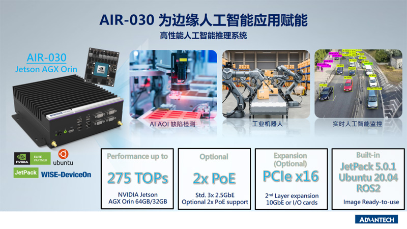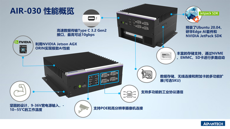 研華的AIR-030邊緣推理系統由最新的NVIDIA Jetson AGX Orin提供支持,可提供高達275 TOPS算力。此外,它還支持多個傳感器的高速接口,這些優勢,使其成為下一代AI機器人的完美選擇。