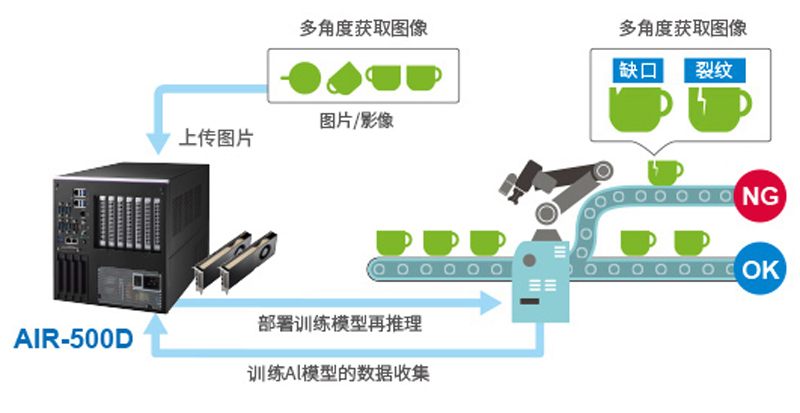 本案例中的客戶是一家機器人視覺設備制造商,他們將自己的機械臂與AI技術相結合,進行檢測缺陷。AIR-500D利用2 x RTX GPU處理不同生產線上捕獲到的大量圖像數據,然后,對這些圖片進行分類、檢測和重新整理,訓練AI模型,提高分析結論的準確性。