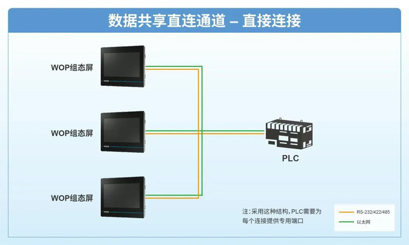 支持多臺組態屏連接同一PLC,WOP通過串口或以太網可與PLC直接連接。創新的N-to-1數據共享連接,單 PLC 可同時接入多臺 WOP 終端,支持多組態屏實時數據同步,不同工位的操作員可同步獲取設備數據,大幅提升跨區域協作效率。