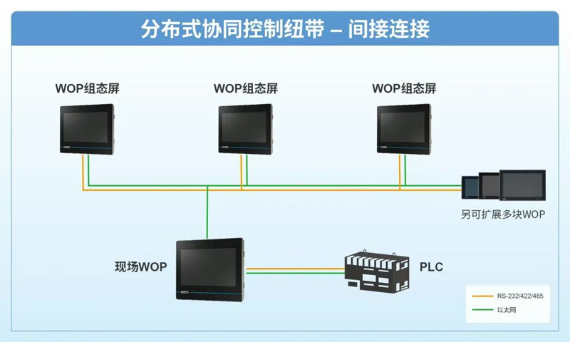 組態屏跨層級連接PLC,現場WOP通過串口/以太網接入 PLC,其他層級WOP與現場WOP建立數據連接,形成分布式控制網絡。通過數據中轉實現分散操作點的多層級協同控制,適用于需要跨層級管理多個分散操作點的場景,在減少物理連接復雜度的同時,保障數據一致性、易于實現分布式協同控制。